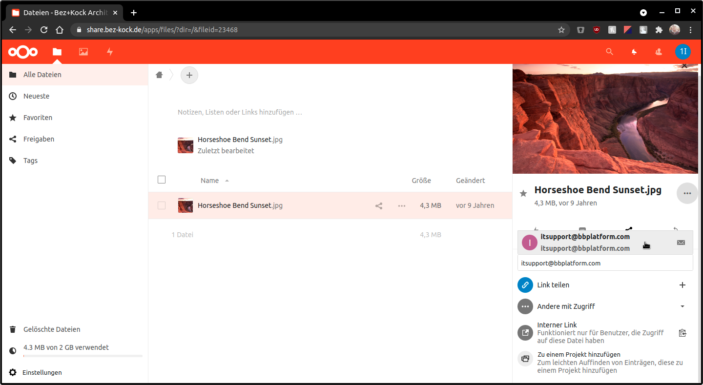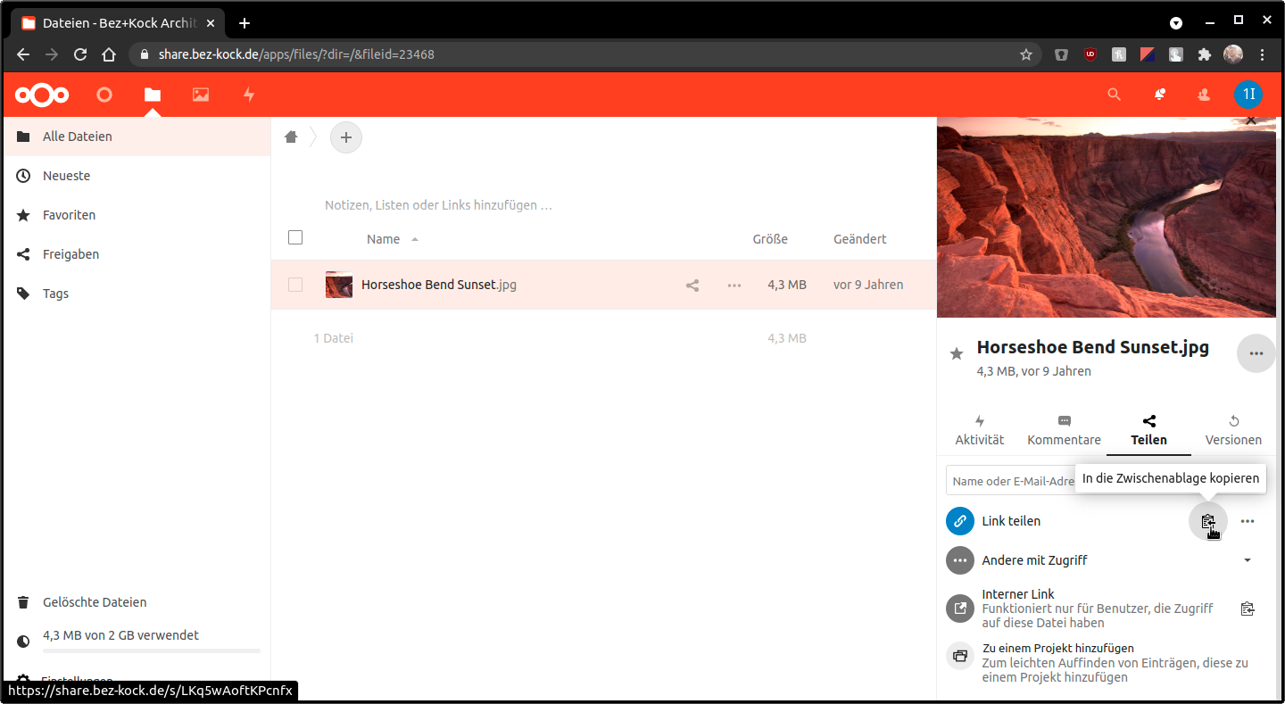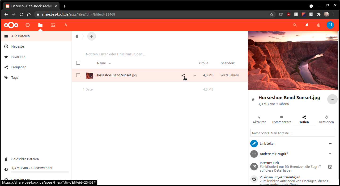 Nachdem man eine Datei oder einen Ordner hochgeladen hat, kann man diese/n nun teilen. Hierzu einfach auf das Teilen Symbol klicken (rechts neben der Datei, bei dem Mauszeiger). Es öffnet sich nun rechts ein Menü.