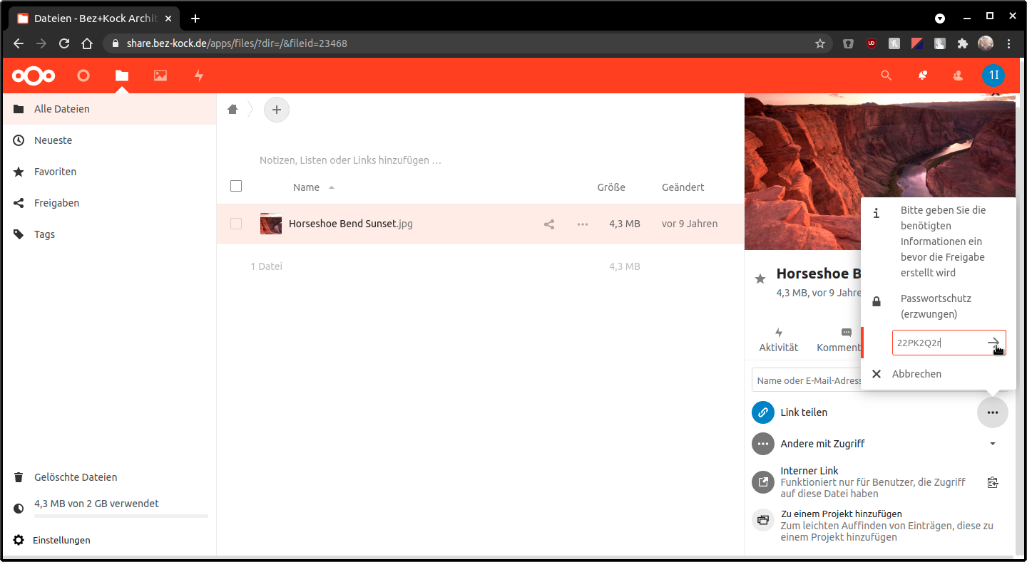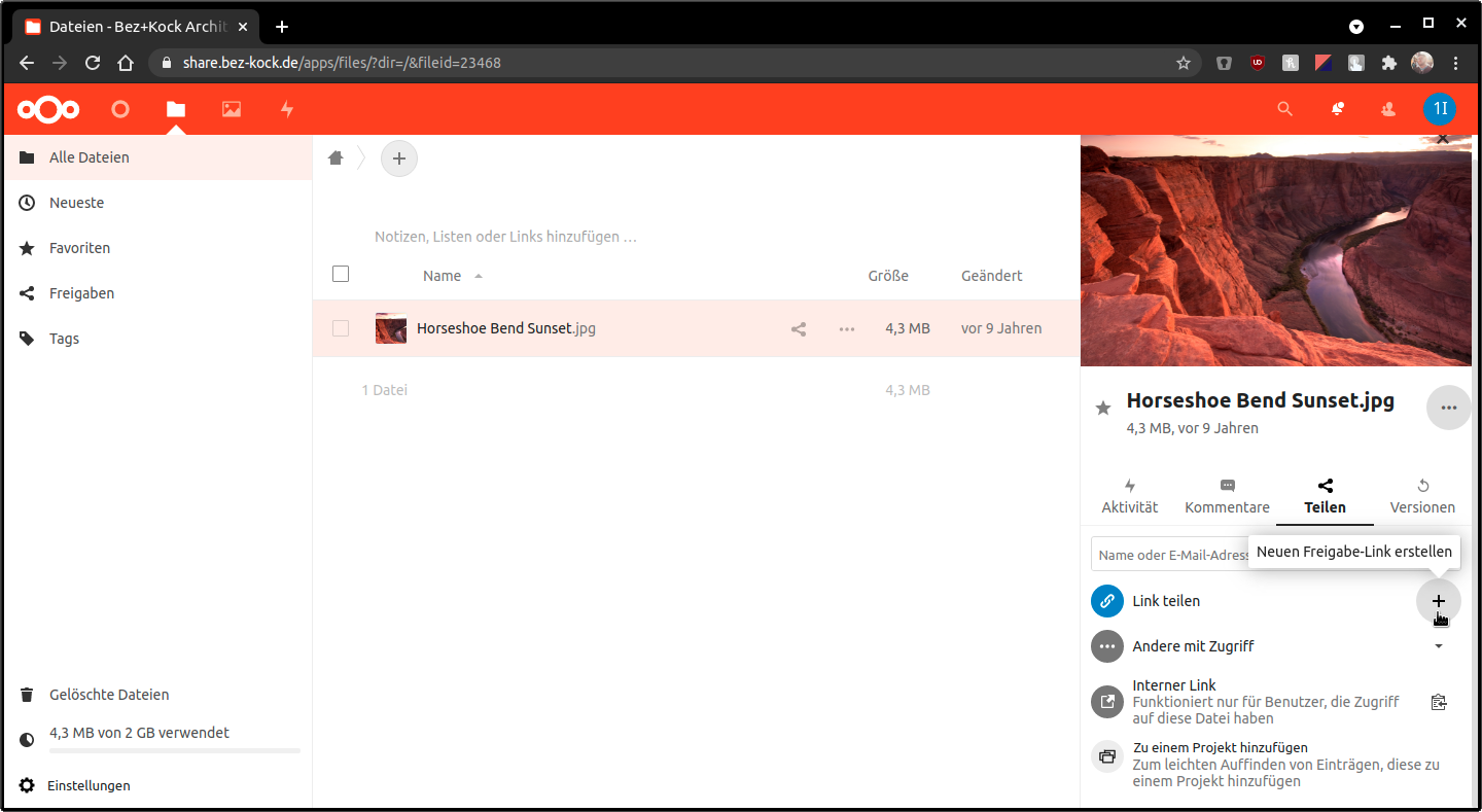 Zweite Möglichkeit ist die manuelle Erstellung einer Freigabe mit Link und Passwort. Hierzu auf das Plus klicken neben "Link teilen"